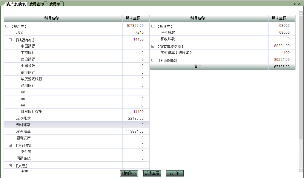 系統(tǒng)提供了“費用查詢”報表,對系統(tǒng)中所有“費用類型”下明細科目的本期發(fā)生額和累計余額進行統(tǒng)計,并可查詢費用明細賬。
