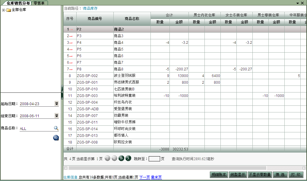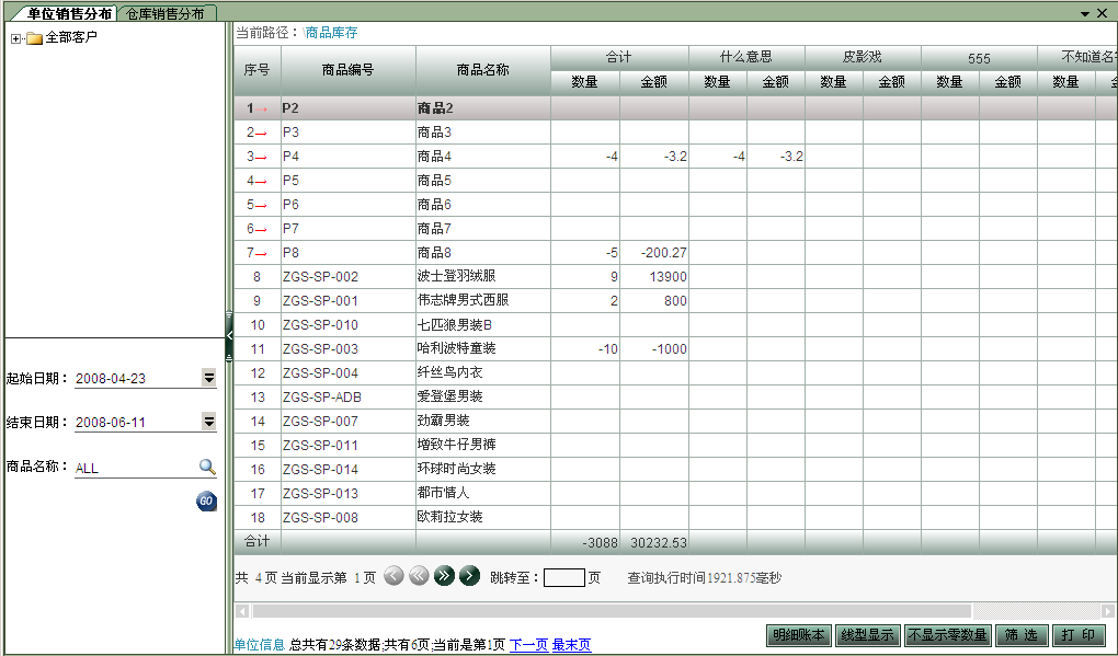 · 線性列表:對(duì)統(tǒng)計(jì)的商品不分類別全部列出,并過濾掉銷售數(shù)量和金額均為零的商品。