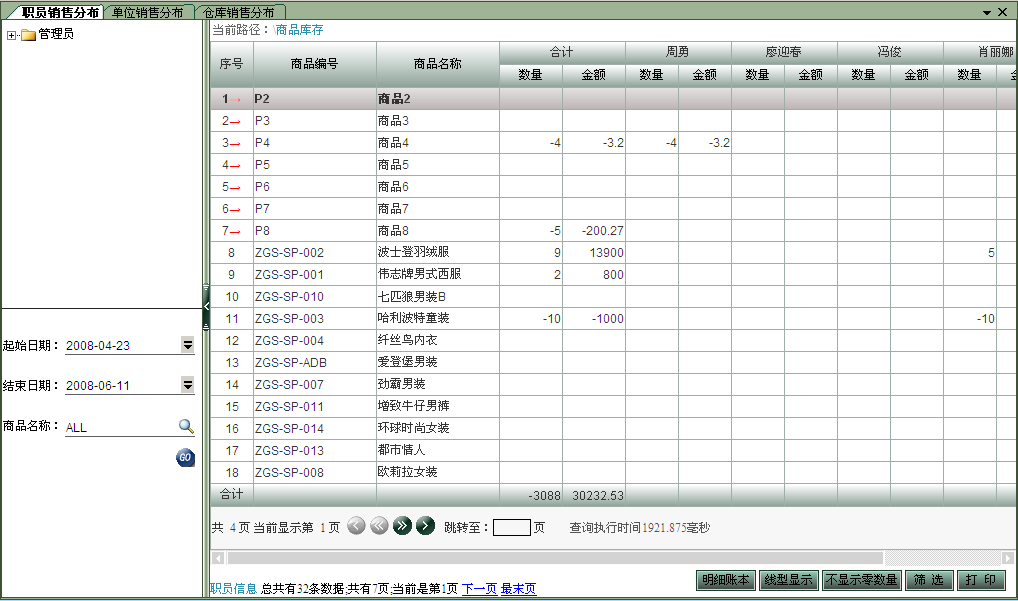 由用戶設(shè)置好查詢時(shí)間、商品名稱、職員名稱后,按確定,進(jìn)入報(bào)表顯示界面。 界面如下圖:
